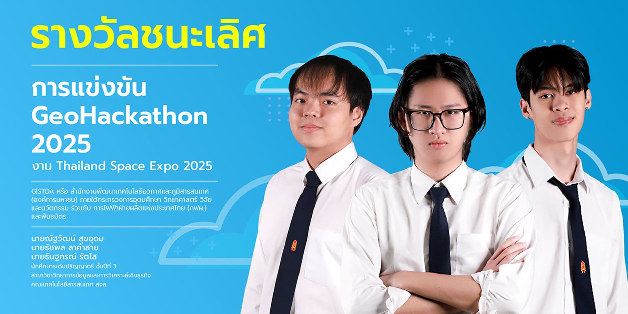 คณะเทคโนโลยีสารสนเทศ สถาบันเทคโนโลยีพระจอมเกล้าเจ้าคุณทหารลาดกระบัง ขอแสดงความยินดีกับนักศึกษาระดับปริญญาตรีของคณะในการคว้ารางวัลชนะเลิศ พร้อมเงินรางวัล 100,000 บาท จากการแข่งขัน GeoHackathon 2025 ในงานเทคโนโลยีอวกาศที่ยิ่งใหญ่ที่สุดในประเทศไทย Thailand Space Expo 2025 ภายใต้หัวข้อ “Visions from the Sky – From Ideas to Impact” จัดโดย GISTDA หรือ สำนักงานพัฒนาเทคโนโลยีอวกาศและภูมิสารสนเทศ (องค์การมหาชน) ภายใต้กระทรวงการอุดมศึกษา วิทยาศาสตร์ วิจัย และนวัตกรรม ร่วมกับการไฟฟ้าฝ่ายผลิตแห่งประเทศไทย (กฟผ.) และพันธมิตร ที่จัดขึ้นระหว่างวันที่ 16–18 ตุลาคม 2568 ที่ผ่านมา ณ ทรู ไอคอน ฮอลล์ ชั้น 7 ไอคอนสยาม กรุงเทพมหานคร