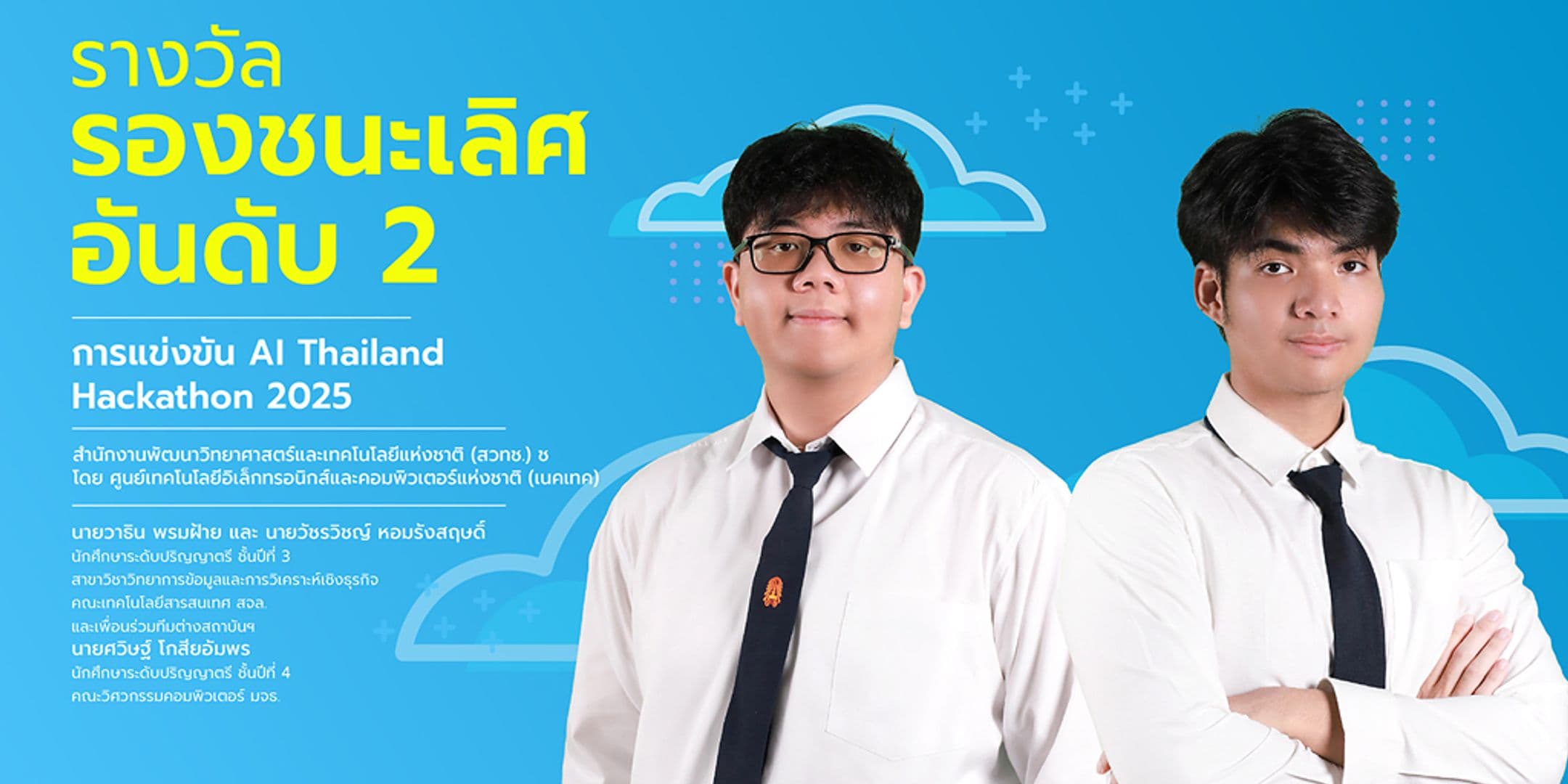คณะเทคโนโลยีสารสนเทศ สถาบันเทคโนโลยีพระจอมเกล้าเจ้าคุณทหารลาดกระบัง ขอแสดงความยินดีกับนักศึกษาระดับปริญญาตรีของคณะ และเพื่อนร่วมทีมต่างสถาบันฯ ในการคว้ารางวัลรองชนะเลิศอันดับ 2 จากการแข่งขัน AI Thailand Hackathon 2025 ภายใต้หัวข้อ “From AI Model to Service on AI for Thai” ที่จัดขึ้นโดย สำนักงานพัฒนาวิทยาศาสตร์และเทคโนโลยีแห่งชาติ (สวทช.) โดย ศูนย์เทคโนโลยีอิเล็กทรอนิกส์และคอมพิวเตอร์แห่งชาติ (เนคเทค) ซึ่งได้มีการแข่งขันรอบชิงชนะเลิศและประกาศผลรางวัลไปเมื่อวันที่ 2 สิงหาคม 2568 ที่ผ่านมา